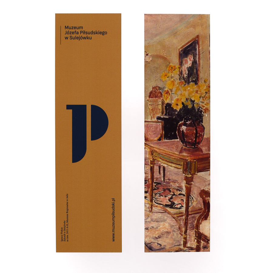 Zakładka o wykończeniu matowym. Różne grafiki po obu stronach. Na awersie motyw obrazu Ignacego Pinkasa, Salonik w Sulejówku.